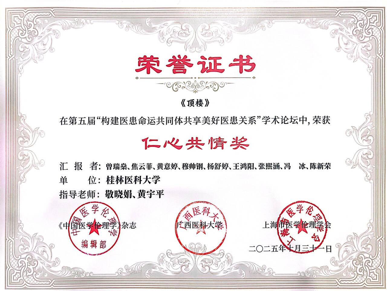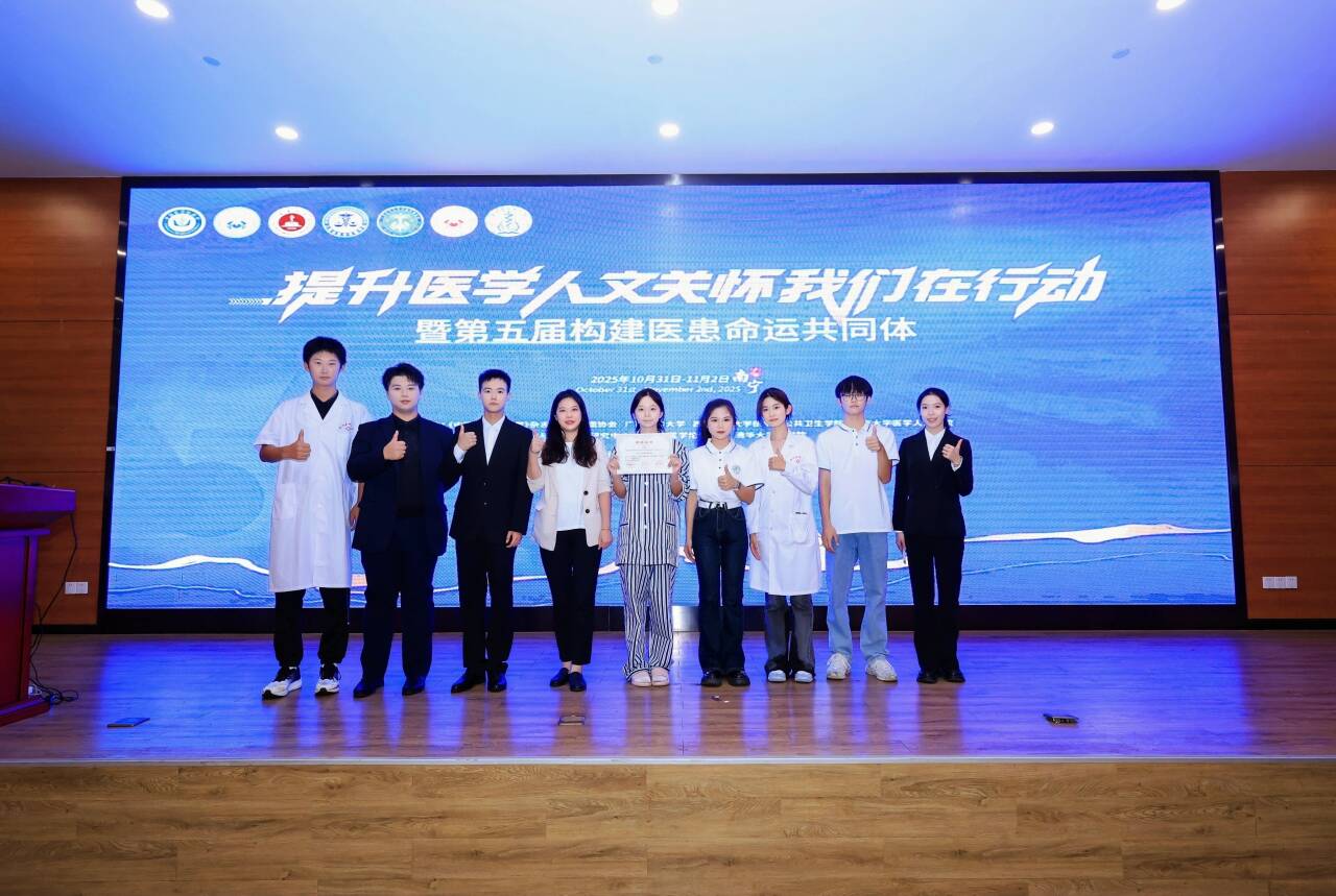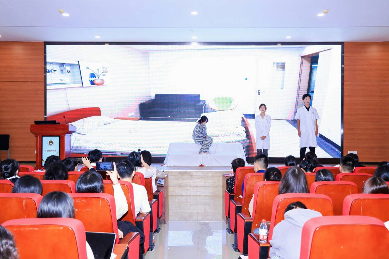 2025年10月31日晚,桂林医科大学第二临床医学院师生代表受邀参加“提升医学人文关怀我们在行动暨第五届构建医患命运共同体”学术研讨会,并在广西医科大学卓越楼21楼学术报告厅的“论坛一:医学生论坛”分会场演出原创情景剧《顶楼》。